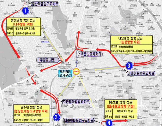 ÅëÁ¦ ±¸°£ Â÷·® ¿ìȸµµ·Î´Â ¡ã³ó¼º±³Â÷·Î¿¡¼ ¹é¿î±¤Àå ¹æÇâ ¡æ ¿ù»ê¸¶À» ÀÔ±¸ ±³Â÷·Î¿¡¼ ¾ç±ÃÀå ¹æÇ⠡㱤ÁÖ´ë¿¡¼ ¹é¿î±¤Àå ¡æ È£¹ÝÈúÇÏÀÓ ±³Â÷·Î¿¡¼ ¾ç±ÃÀå ¹æÇâ ¡ã³²±¤ÁÖ(ºÀ¼±¡¤¹æ¸²)¿¡¼ ¹é¿î±¤Àå ¡æ ¹Ì·¡¾Æµ¿º´¿ø ±³Â÷·Î¿¡¼ ±âµ¶º´¿ø(¼öÇǾƿ©°í) ¹æÇâ ¡ãºÀ¼±µ¿¿¡¼ ¹é¿î±¤Àå ¹æÇâ ¡æ ´ëÈ¾ÆÆÄÆ® ÀÔ±¸ ±³Â÷·Î¿¡¼ ºÀ¼±Áß¾Ó·Î(ºÀ¼±Ãʱ³) ¹æÇâ µîÀÌ´Ù.