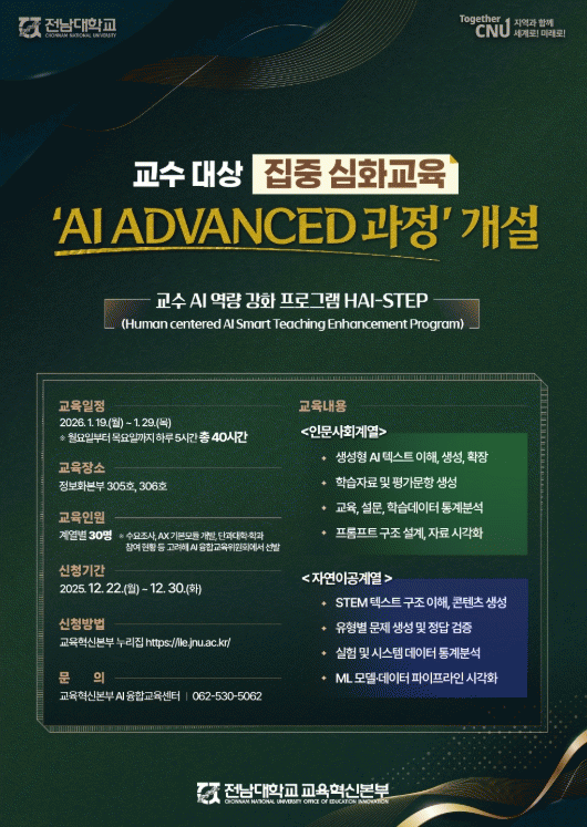 24ÀÏ Àü³²´ëÇб³¿¡ µû¸£¸é, Àü³²´ëÇб³ ±³À°Çõ½Åº»ºÎ´Â AI ´ëÀüȯ ½Ã´ë¿¡ ¼±Á¦ÀûÀ¸·Î ´ëÀÀÇÏ°í ±³¼öÀÚÀÇ AI Ȱ¿ë ¿ª·®À» °ÈÇϱâ À§ÇØ ¡®AI ADVANCED °úÁ¤¡¯À» °³¼³ÇÑ´Ù.