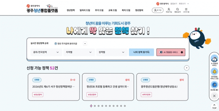 ±¤ÁÖû³âÅëÇÕÇ÷§ÆûÀº ÀÏÀÚ¸®¡¤ÁÖ°Å¡¤±³À°¡¤º¹Áö¹®È µî ´Ù¾çÇÑ Ã»³âÁ¤Ã¥ Á¤º¸¸¦ ÀΰøÁö´É(AI) ¸ÂÃãÇü ¼ºñ½º·Î Á¦°øÇϰí, Á¤Ã¥ °Ë»öºÎÅÍ ½Åû±îÁö ¿ø½ºÅéÀ¸·Î °¡´ÉÇϵµ·Ï °³ÆíÇÑ °ÍÀÌ Æ¯Â¡ÀÌ´Ù.