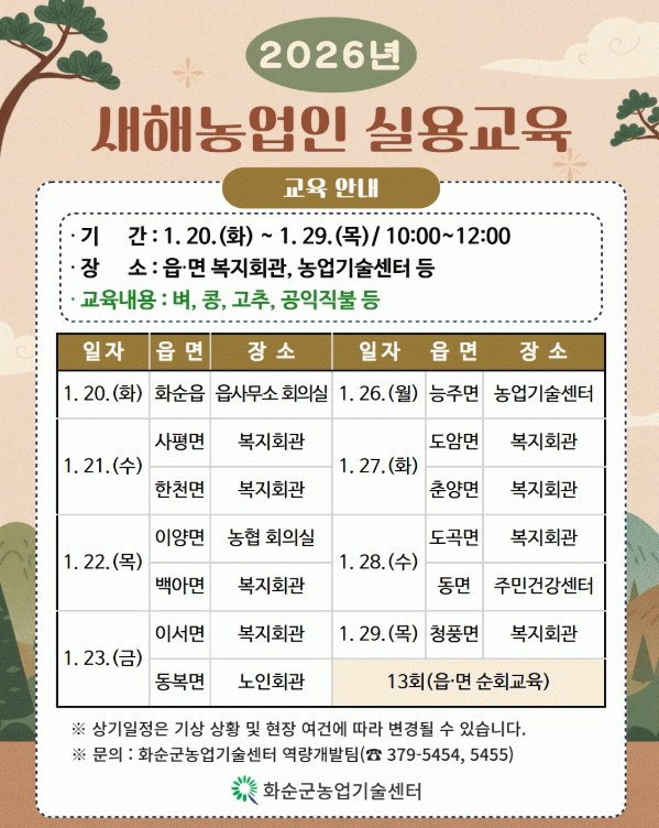 »õÇØ³ó¾÷Àνǿ뱳À°Àº »õÇØ ¿µ³óÀ» ¾ÕµÐ ³ó¾÷ÀεéÀÌ Ã¼°èÀûÀÎ ¿µ³ó °èȹÀ» ¼ö¸³ÇÒ ¼ö ÀÖµµ·Ï µ½°í, 2026³â ÇÙ½É ³ó¾÷Á¤Ã¥°ú Áö¿ª ¸ÂÃãÇü Àç¹è±â¼úÀ» °øÀ¯ÇØ ³ó¾÷ °æÀï·Â °È¸¦ µµ¸ðÇϱâ À§ÇÑ ±³À°ÀÌ´Ù.