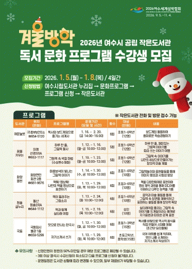 À̹ø ÇÁ·Î±×·¥Àº ¹æÇÐÀ» ¸Â¾Æ Çлý°ú ¼ºÀÎÀ» ´ë»óÀ¸·Î µ¶¼¸¦ ÅëÇØ âÀǷ¡¤»ç°í·ÂÀ» ÁõÁøÇϱâ À§ÇÑ ´Ù¾çÇÑ µ¶¼¹®È ÇÁ·Î±×·¥À¸·Î ¸¶·ÃµÆ´Ù. ¿î¿µ ±â°£Àº ¿À´Â 2026³â 1¿ù 12ÀϺÎÅÍ 2¿ù 24ÀϱîÁö¸ç ÇÁ·Î±×·¥º° ±â°£ÀÌ ´Ù¸£´Ù.