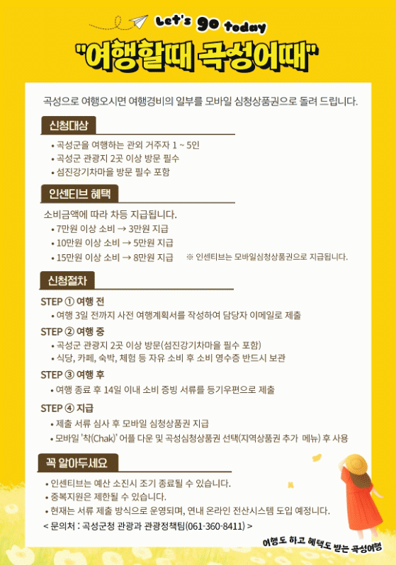 Âü¿© ¹æ¹ýµµ °£´ÜÇÏ´Ù. ¿©Çà 3ÀÏ Àü±îÁö »çÀü ¿©Çà°èȹ¼¸¦ ´ã´çÀÚ À̸ÞÀÏ·Î Á¦ÃâÇÑ ÈÄ °î¼º ¿©ÇàÀ» Áñ±ä ÈÄ ¿©Çà Á¾·á ÈÄ 14ÀÏ À̳» ¼Òºñ ¿µ¼öÁõ µî Áõºù¼·ù¸¦ µî±â¿ìÆíÀ¸·Î Á¦ÃâÇÏ¸é µÈ´Ù. ½É»ç ÈÄ ¸ð¹ÙÀÏ ½Éû»óǰ±Ç Áö±ÞÇÏ°Ô µÈ´Ù. ÇöÀç´Â ¼·ù Á¦Ãâ ¹æ½ÄÀ¸·Î ¿î¿µÇϰí ÀÖÀ¸³ª, ±ºÀº ¿ÃÇØ ¾ÈÀ¸·Î ¿Â¶óÀÎ Àü»ê ½Ã½ºÅÛÀ» ±¸ÃàÇØ ½ÅûºÎÅÍ Áö±Þ±îÁö ´õ ½±°í Æí¸®ÇÏ°Ô °³¼±ÇÒ °èȹÀÌ´Ù.