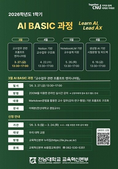 10ÀÏ Àü³²´ë¿¡ µû¸£¸é, Àü³²´ëÇб³ ±³À°Çõ½Åº»ºÎ(º»ºÎÀå Á¤Àº°æ)´Â 2026Çг⵵ 1Çбâ Àü ±³¿øÀ» ´ë»óÀ¸·Î ¡®AI BASIC °úÁ¤¡¯À» ¿î¿µÇÑ´Ù.