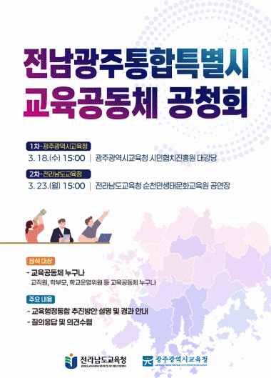 ù ¹øÂ° °øÃ»È¸´Â 3¿ù 18ÀÏ ¿ÀÈÄ 3½Ã ±¤ÁÖ±¤¿ª½Ã±³À°Ã» ½Ã¹ÎÇùÄ¡ÁøÈï¿ø¿¡¼ ¿¸®°í, À̾î 3¿ù 23ÀÏ(¿ù) ¿ÀÈÄ 3½Ã Àü¶ó³²µµ±³À°Ã»¼øÃµ¸¸»ýŹ®È±³À°¿ø¿¡¼ µÎ ¹øÂ° °øÃ»È¸°¡ ¿¸°´Ù.