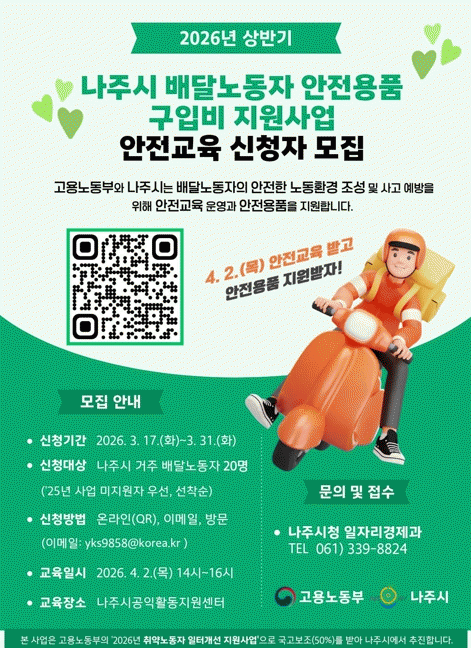 ³ªÁֽô ¹è´Þ³ëµ¿ÀÚÀÇ ¾ÈÀüÇÑ ³ëµ¿È¯°æ Á¶¼ºÀ» À§ÇØ ¹è´Þ³ëµ¿ÀÚ ¾ÈÀü¿ëǰ ±¸ÀÔºñ Áö¿ø»ç¾÷À» ÃßÁøÇϰí ÀÌ·ûÂ÷ ±³Åë¾ÈÀü±³À°À» ½Ç½ÃÇÑ´Ù°í 18ÀÏ ¹àÇû´Ù.
