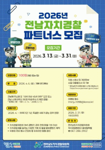 Àü³²ÀÚÄ¡°æÂû ÆÄÆ®³Ê½º´Â SNS ÄÜÅÙÃ÷ Á¦ÀÛ°ú È«º¸ Ȱµ¿À» ÅëÇØ ÀÚÄ¡°æÂû Á¦µµ¿Í Á¤Ã¥À» µµ¹Î¿¡°Ô ¾Ë¸®´Â È«º¸´ÜÀ¸·Î, °³ÀÎÀ̳ª ÆÀ ´ÜÀ§·Î ÃÑ 100¸íÀ» ¼±¹ßÇÒ ¿¹Á¤ÀÌ´Ù.
