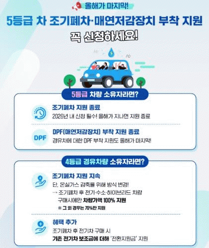 ¶ÇÇÑ ¹èÃâ°¡½º 5µî±Þ °æÀ¯Â÷¿¡ ¸Å¿¬ Àú°¨ÀåÄ¡(DPF)¸¦ ¼³Ä¡ÇÏ¸é ¼³Ä¡ºñÀÇ ¾à 90%¸¦ Áö¿øÇϸç, °Ç¼³±â°è(´ýÇÁÆ®·°) ¸Å¿¬ Àú°¨ÀåÄ¡ ¼³Ä¡¿Í Áö°ÔÂ÷¡¤±¼»è±â¡¤·Ñ·¯¡¤·Î´õ ¿£Áø ±³Ã¼ ºñ¿ëÀº Àü¾× Áö¿øÇÑ´Ù.