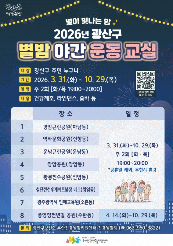 º°¹ã¾ß°£¿îµ¿±³½ÇÀº ³²³à³ë¼Ò ´©±¸³ª ¹«·á·Î Âü¿©ÇÒ ¼ö ÀÖ´Â °Ç° üÁ¶·Î, ±¤»ê±¸ 8°³ °ø¿ø¿¡¼ È¿äÀϰú ¸ñ¿äÀÏ ÁÖ 2ȸ ¿ÀÈÄ 7½ÃºÎÅÍ 8½Ã±îÁö ÁøÇàÇÑ´Ù.
