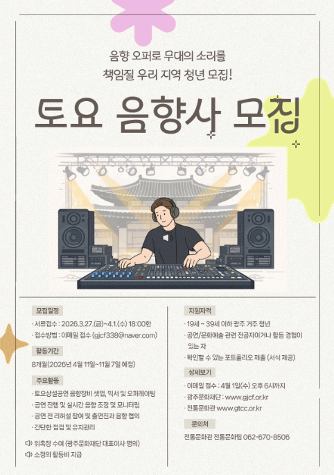 Åä¿ä À½Çâ»ç´Â ÀüÅ빮Ȱü¿¡¼ ÁøÇàµÇ´Â Åä¿ä»ó¼³°ø¿¬ÀÇ À½Çâ Àåºñ ¼¼ÆÃºÎÅÍ ½Ç½Ã°£ À½Çâ Á¶Á¤±îÁö °ø¿¬ ÇöÀåÀÇ À½Çâ Àü¹ÝÀ» ´ã´çÇÑ´Ù. Ȱµ¿±â°£Àº Åä¿ä»ó¼³°ø¿¬ Çà»ç ÀÏÁ¤°ú µ¿ÀÏÇÑ ¿¬ 24ȸÀ̸ç, ¸ðÁýÀοøÀº 1¸íÀÌ´Ù.