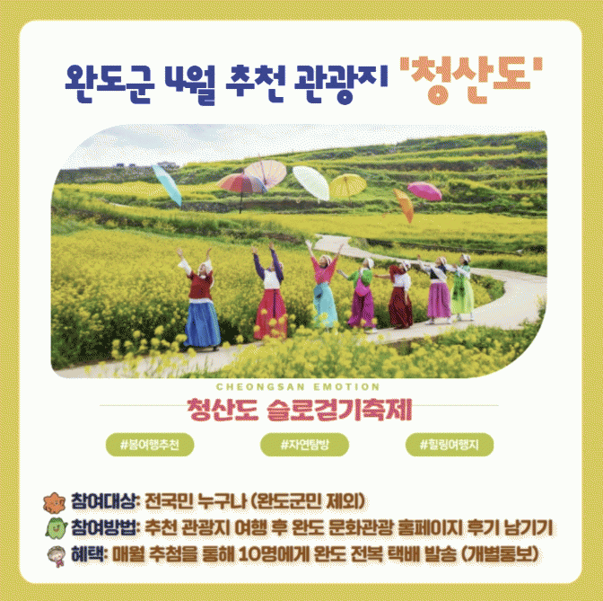 4¿ù ÇÑ ´Þ µ¿¾È ¡®Ã»»êµµ¿¡¼ Ä¡À¯ÇØ º½¡¯À» ÁÖÁ¦·Î ¡®½½·Î°È±â ÃàÁ¦¡¯µµ ¿·Á ¼ÆíÁ¦±æ, ¹ü¹ÙÀ§±æ µî °÷°÷¿¡¼ °È±â, °ø¿¬ üÇè µî ´Ù¾çÇÑ ÇÁ·Î±×·¥À» Áñ±æ ¼ö ÀÖ´Ù.