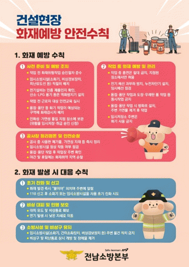 ÃÖ±Ù °Ç¼³ÇöÀåÀº ¿ëÁ¢¡¤¿ë´Ü ÀÛ¾÷, Àü±â »ç¿ë Áõ°¡ µîÀ¸·Î ÈÀç À§ÇèÀÌ ³ôÀº ¸¸Å »çÀü ¿¹¹æ°ú öÀúÇÑ °ü¸®°¡ ¹«¾ùº¸´Ù Áß¿äÇÏ´Ù. ÀÌ¿¡ ¿©¼ö¼Ò¹æ¼´Â ¡ãÀÛ¾÷ Àü ¾ÈÀü¼öÄ¢ Áؼö ¡ãÀӽüҹæ½Ã¼³ ¼³Ä¡ ¹× Á¡°Ë ¡ã°¡¿¬¼º ÀÚÀç °ü¸® ¡ãÈÀç Ãë¾à ½Ã°£´ë ¼øÂû °È µî ÈÀç ¿¹¹æ ¼öÄ¢À» ÁýÁß ¾È³»Çϰí ÀÖ´Ù.