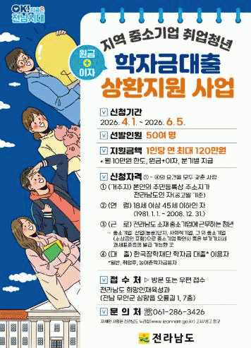 [ÅåÅå´º½º]Àü¶ó³²µµ´Â ÀÎÀçÀÇ Áö¿ª Á¤ÂøÀ» À§ÇØ Áß¼Ò±â¾÷¿¡ Ãë¾÷ÇÑ Ã»³âÀÇ ÇÐÀÚ±Ý ´ëÃâ »óȯÀ» Áö¿øÅ°·Î Çϰí, ¿À´Â 6¿ù 5ÀϱîÁö ´ë»óÀÚ¸¦ ½Åû¹Þ´Â´Ù°í ¹àÇû´Ù.