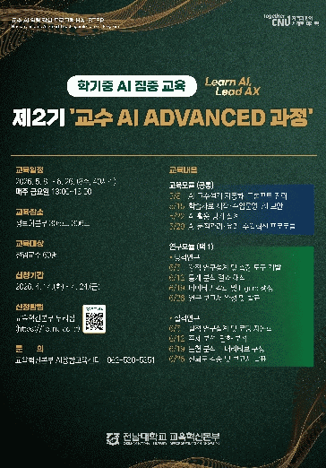 Àü³²´ëÇб³ ±³À°Çõ½Åº»ºÎ´Â ÇâÈÄ¿¡µµ ÇÏ°è ¹× µ¿°è¹æÇÐ, 2Çбâ Çбâ Áß¿¡µµ AI ADVANCED °úÁ¤À» Áö¼ÓÀûÀ¸·Î ¿î¿µÇÒ ¿¹Á¤À̸ç, ±³¼öÀÇ AI Ȱ¿ë ¿ª·®À» ´Ü°èÀûÀ¸·Î °ÈÇÏ¿©, ±³À°°ú ¿¬±¸ ÇöÀå¿¡¼ Àû¿ë °¡´ÉÇÑ ½ÇÁúÀû AI ±³À°Ã¼°è¸¦ ¸¸µé¾î ³ª°¥ °èȹÀÌ´Ù.