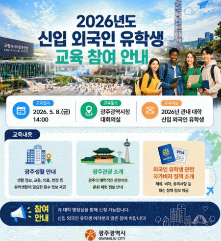 ±¤ÁÖ±¤¿ª½Ã´Â ¿À´Â 5¿ù 8ÀÏ ¿ÀÈÄ 2½Ã ½Ãû ´ëȸÀǽǿ¡¼ ±¤ÁÖÁö¿ª ´ëÇп¡ ÀÔÇÐÇÑ À¯ÇлýµéÀ» ´ë»óÀ¸·Î ¡®2026³â ½ÅÀÔ ¿Ü±¹ÀÎ À¯Çлý ±³À°¡¯À» ½Ç½ÃÇÑ´Ù.