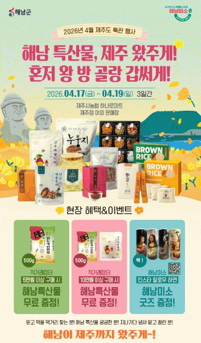 [ÅåÅå´º½º]ÇØ³²±ºÀº ¹Ù´Ù °Ç³Ê Á¦ÁÖ ¼ÒºñÀÚ¸¦ ã¾Æ ¿À´Â 17ÀϺÎÅÍ 19ÀÏ, 3Àϰ£ Á¦ÁֽóóÇù Çϳª·Î¸¶Æ® Á¦ÁÖÁ¡ ¾ß¿ÜƯ¼³¸ÅÀå¿¡¼­ ³ó¼öƯ»ê¹° Á÷°Å·¡ÀåÅ͸¦ ¿î¿µÇÑ´Ù. À̹ø Çà»ç¿¡¼­´Â ÇØ³²°í±¸¸¶¸¦ ºñ·ÔÇØ Àâ°î·ù, Â÷·ù, °¡°ø½Äǰ µî 100¿©Á¾ÀÇ ´Ù¾çÇÑ ³ó¼öƯ»ê¹°À» ÇÕ¸®ÀûÀÎ °¡°ÝÀ¸·Î ¼±º¸ÀÏ ¿¹Á¤ÀÌ´Ù.