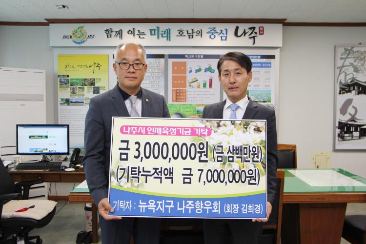 ³ªÁÖ½Ã(½ÃÀå °ÀαÔ)´Â 17ÀÏ ¹Ì±¹ ´º¿åÁö±¸ ³ªÁÖÇâ¿ìȸ ±èÈñ°æ ȸÀå°ú ¿ì±âÁ¶ ºÎȸÀåÀ» ºñ·ÔÇÑ Çâ¿ìȸ¿øµéÀÌ ½ÃûÀ» ¹æ¹®ÇØ, Áö¿ªÀÎÀçÀ°¼º ÀåÇÐ±Ý 3¹é¸¸¿øÀ» ±âŹÇß´Ù°í ¹àÇû´Ù.