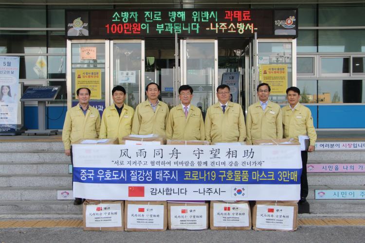 ³ªÁֽô Áß±¹¿¡¼ Áö¿øµÈ ¿¹¹æ ¸¶½ºÅ©¸¦ Àç³¾ÈÀü´ëÃ¥º»ºÎ¿¡ ºñÄ¡ÇÏ°í ¸¶½ºÅ© ±¸ÀÔÀÌ ¾î·Á¿î Àú¼ÒµæÃþ°ú ½Ãû, À¾¡¤¸é¡¤µ¿À» ¹æ¹®ÇÏ´Â ½Ã¹Îµé¿¡°Ô ¹èºÎÇÒ °èȹÀÌ´Ù.°ÀÎ±Ô ³ªÁÖ½ÃÀåÀº ¡°³ªÁÖ½Ã¿Í Áß±¹ ÅÂÁÖ½Ã¿Í ³²Ã¢½Ã°¡ ÁÖ°í¹ÞÀº ¸¶½ºÅ©´Â ´Ü¼øÈ÷ ¹æ¿ª ¹°Ç° Áö¿øÀ» ³Ñ¾î ¾î·Á¿î ½Ã±â¿¡ ÇÔ²² ¿ª°æÀ» À̰ܳ»¸é¼ ´õ¿í ±í¾îÁø ¿ìÁ¤ÀÇ »ó¡À¸·Î ±â¾ïµÉ °Í¡±À̶ó¸ç ¡°ÅÂÁֽùεéÀÇ µû¶æÇÑ ¸¶À½ÀÌ Àß ÀüÇØÁú ¼ö ÀÖµµ·Ï ¼ÒÁßÈ÷ »ç¿ëÇϰڴ١±°í È´ä ¸Þ½ÃÁö¸¦ ÀüÇß´Ù.