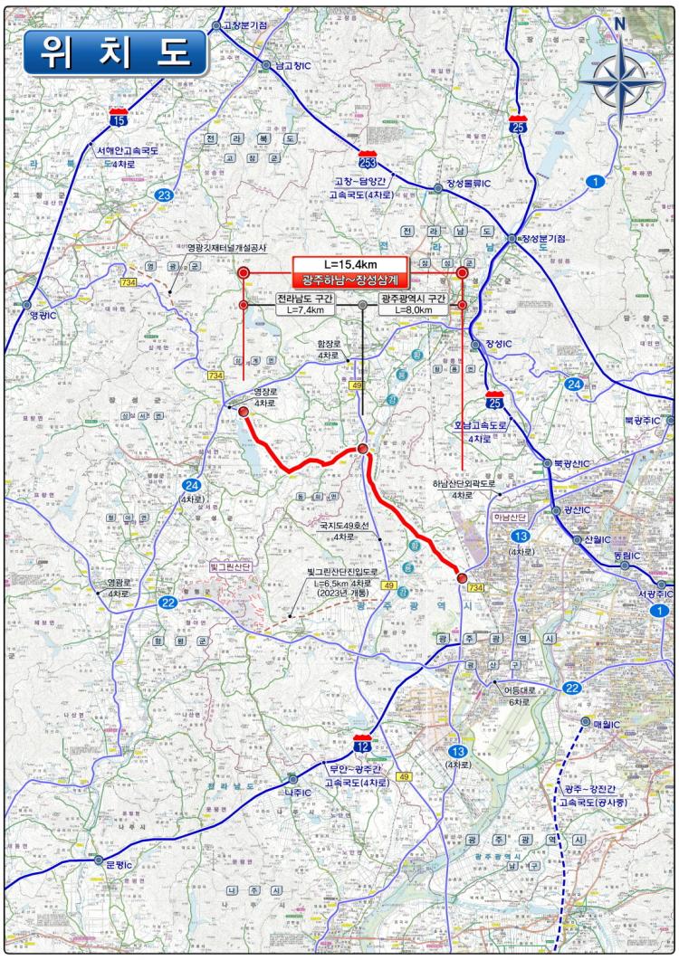 ±¤ÁÖ½Ã¿Í Àü³²µµ´Â ±¤Áֽà ±¤»ê±¸ Àå¼öµ¿ Àå¼ö±³Â÷·Î¿¡¼ °íºÀ·Î ÀÓ°îÀ» °ÅÃÄ À强±¸°£ Áö¹æµµ 734È£¼±À» µû¶ó ¼ö¾çÀú¼öÁö ¾Õ À强 »ó¹«ÆòȰø¿ø±îÁö 15.4§°(±¤ÁÖ 8§°, Àü³² 7.4§°) ±âÁ¸ 2Â÷·Î¸¦ 4Â÷·Î·Î È®ÀåÇϸç, ±ÞÄ¿ºê µî ÀϺΠ¼±ÇüÀÌ ºÒ·®ÇÑ ±¸°£Àº ¼±Çü°³·®ÀÌ ÀÌ·ç¾îÁø´Ù.