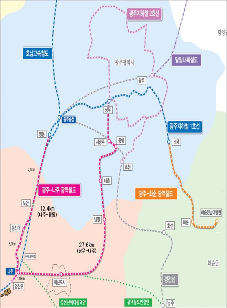 ÀÌ´Â ±¤ÁÖÁöÇÏö(Æòµ¿․»ó¹«․¼ÒÅÂ)¿¡ ÀαÙÀÇ ³ªÁÖ․ȼø µîÀ» ±¤¿ªÃ¶µµ·Î ¿¬°áÇØ ½Ã․µµ¹ÎÀÇ ÀÌ¿ë ÆíÀǸ¦ µµ¸ðÇϱâ À§ÇÑ °ÍÀÌ´Ù. È£³²¼± °í¼Óöµµ¿Í °æÀü¼± °í¼ÓÀüö, ³ª¾Æ°¡ Àå·¡ ´Þºû³»·úöµµ±îÁö ¿¬°áÇÔÀ¸·Î½á ±¤ÁÖ․Àü³²Àº ¹°·Ð ÀüºÏ±îÁö ¿¬°èÇÒ ¼ö ÀÖ´Â Å« ±×¸²ÀÇ Ã¶µµ¸ÁÀ» ±¸ÃàÇϱâ À§ÇÑ °ÍÀÌ´Ù.
