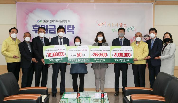 À̳¯ ±âŹ½Ä¿¡´Â µ¿±¤¾ç³óÇù ³ó°¡ÁֺθðÀÓ¿¡¼ CMS 60°èÁÂ, ±¤¾ç½Ã»ê¸²Á¶ÇÕ¿¡¼ 1õ¸¸ ¿ø, ±¤¾ç½Ã»õ¸¶À»±Ý°í¿¡¼ 2¹é¸¸ ¿ø, ÇØ¾Æ¾î¸°ÀÌÁý¿¡¼ 28¸¸ 5õ ¿øÀÇ ¼ÒÁßÇÑ ÈÄ¿ø±ÝÀ» Àü´ÞÇß´Ù.