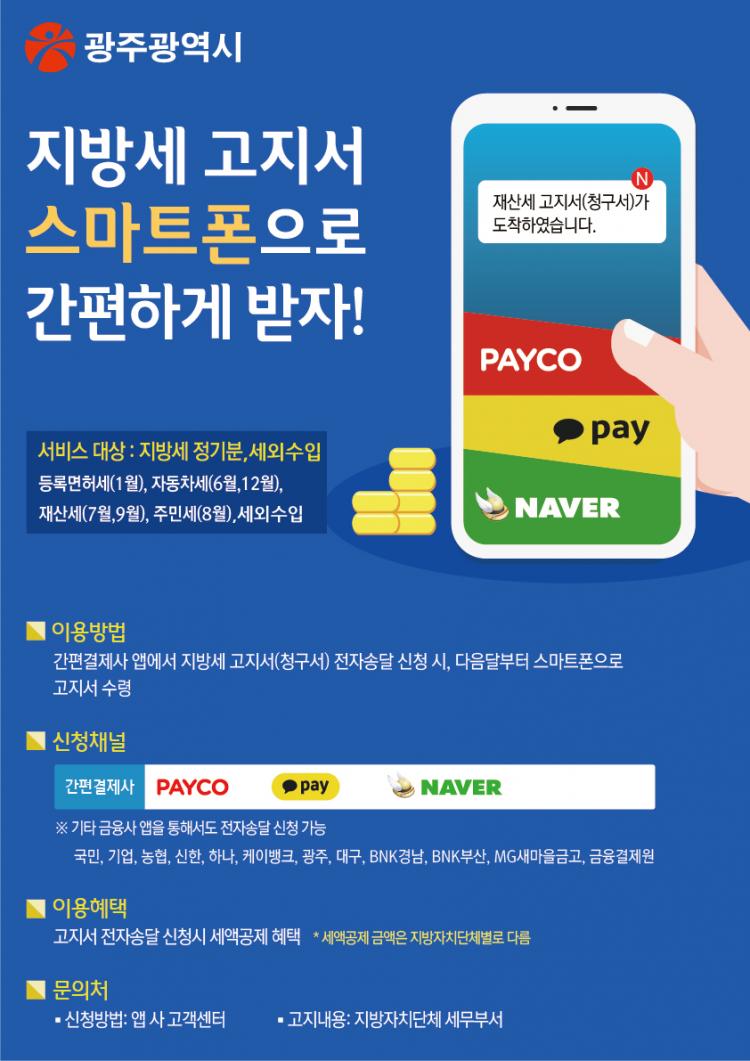 ÀüÀÚ¼Û´Þ Á¦µµ´Â °ú¼¼°üûÀÌ º¸Åë °íÁöÇÏ´Â Áö¹æ¼¼(Áֹμ¼, Àç»ê¼¼, ÀÚµ¿Â÷¼¼, µî·Ï¸éÇã¼¼ µî)¸¦ īī¿ÀÅå, ³×À̹ö, ÆäÀÌÄÚ µî °£Æí°áÁ¦»ç ¾Û°ú ±¤ÁÖÀºÇà, ³óÇù µî 15°³ ±ÝÀ¶»ç ¾Û, ÀüÀÚ»ç¼ÇÔ(À§Åýº), ÀüÀÚ¿ìÆí µîÀ¸·Î Æí¸®ÇÏ°Ô °íÁö¼¸¦ ¼Û´Þ¹Þ°í ³³ºÎÇÒ ¼ö ÀÖ´Â Á¦µµ´Ù.