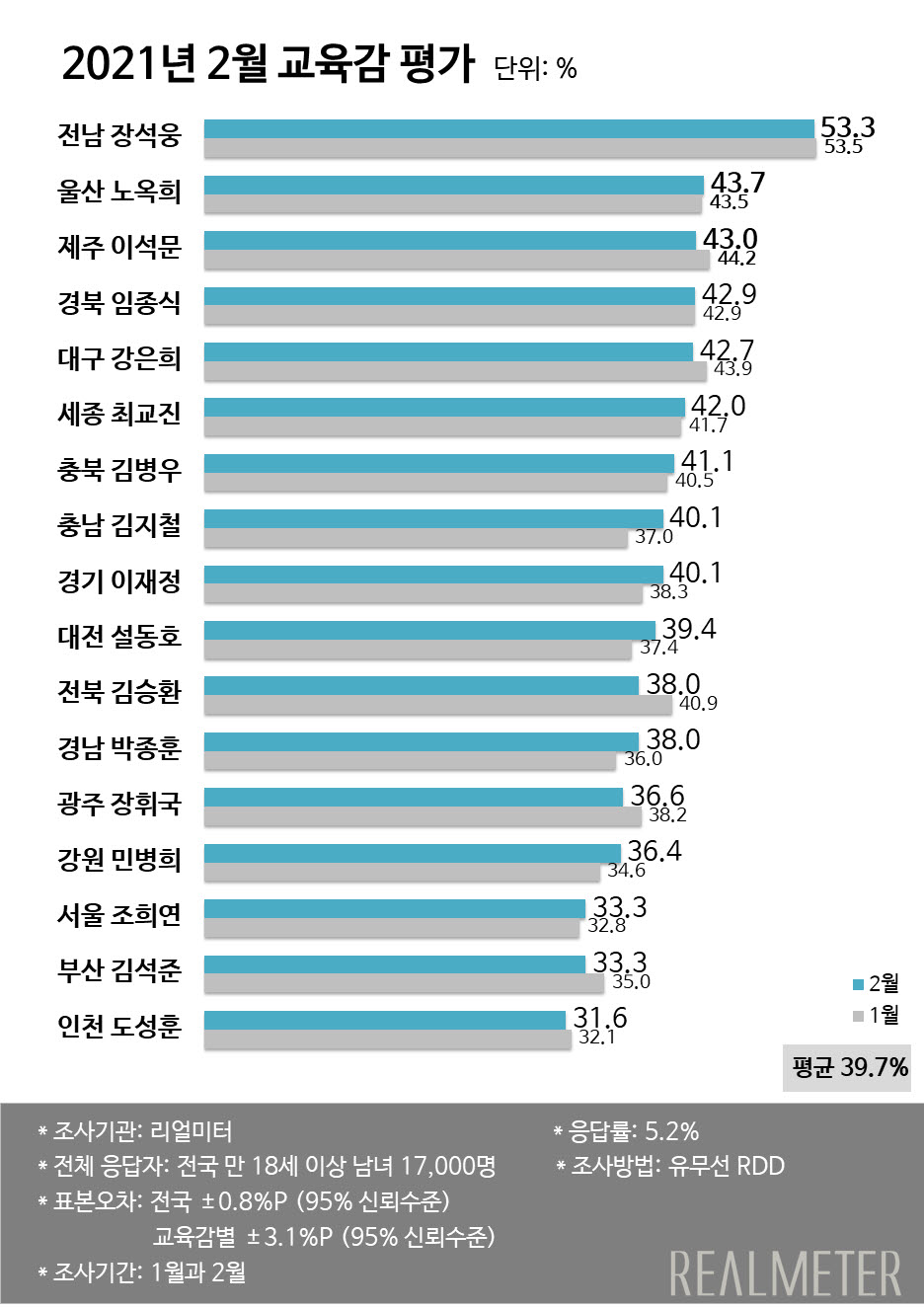 5ÀÏ(±Ý) Àü¶ó³²µµ±³À°Ã»¿¡ µû¸£¸é, Àå¼®¿õ ±³À°°¨Àº ¿©·ÐÁ¶»ç ±â°ü ¸®¾ó¹ÌÅͰ¡ ½Ç½ÃÇÑ ÁÖ¹ÎÁ÷¼± 3±â Àü±¹ 17°³ ½Ã¡¤µµ±³À°°¨ÀÇ 2021³â 2¿ù Á÷¹«¼öÇà Æò°¡¿¡¼ 53.3%ÀÇ ÁöÁö¸¦ ¾ò¾î Áö³ 2019³â 5¿ù ÀÌÈÄ 22°³¿ù ° 1À§¸¦ ÁöÄ×´Ù.