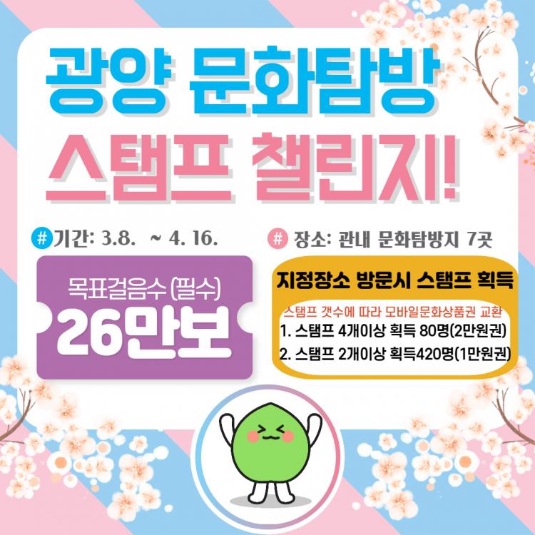 [ÅåÅå´º½º]±¤¾ç½Ã°¡ °È±â ÁÁÀº °èÀý º½À» ¸Â¾Æ ½Ã¹ÎµéÀÇ ºñ´ë¸é °È±â¿îµ¿ À¯µµ ¹× ½ÅüȰµ¿ ÁõÁøÀ» À§ÇØ Áö¿ª ³» ¹®È޹æÁö 7°÷À» ¼±Á¤ÇØ ¸ð¹ÙÀÏ¾Û ¿öÅ©¿Â ½ºÅÆÇÁ Åõ¾î 縰Áö¸¦ ¿î¿µÇÑ´Ù.