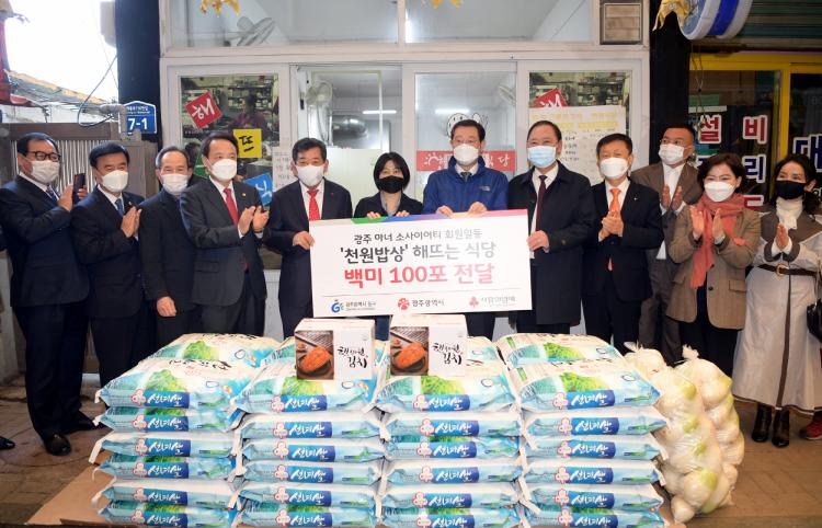 À̳¯ ÀÌ ½ÃÀåÀÇ ¹æ¹®¿¡´Â ÀÓÅà µ¿±¸Ã»Àå, ½ÃÀÇ¿ø, ±¤ÁÖ»çȸº¹Áö°øµ¿¸ð±Ýȸ, ¾Æ³Ê¼Ò»çÀÌ¾îÆ¼ ȸ¿ø µîÀÌ ÇÔ²² ÇØ ½Ä´ç ¿î¿µÀÇ ¾Ö·Î»çÇ×À» ÆÄ¾ÇÇÏ´Â ÇÑÆí, ½Ò 20kg 100Æ÷(600¸¸¿ø »ó´ç)¸¦ Àü´ÞÇß´Ù.