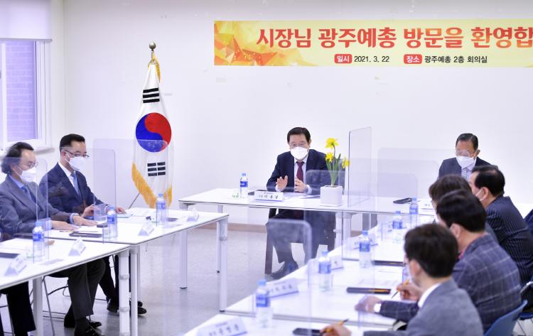 À̳¯ ÀÌ ½ÃÀåÀº ±¤ÁÖ¿¹ÃÑȸ°üÀ» ¹æ¹®ÇØ ÀÓ¿ø½Ä ±¤ÁÖ¿¹ÃÑ È¸ÀåÀ» ºñ·ÔÇØ 10°³ ÇùȸÀåµé°ú °£´ãȸ¸¦ °®°í Äڷγª19·Î Å« Ÿ°ÝÀ» ÀÔÀº ¹®È¿¹¼ú°èÀÇ °íÃæÀ» ûÃëÇÏ°í ´ëÃ¥ µîÀ» ³íÀÇÇß´Ù.