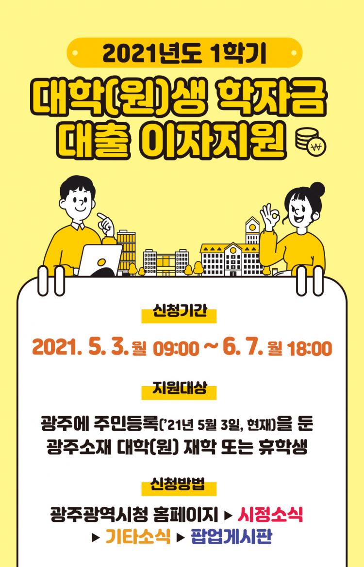 Áö¿ø´ë»óÀº °ø°íÀÏ(2021.5.3.) ÇöÀç ±¤Áֽÿ¡ Áֹεî·ÏÀ» µÐ ±¤ÁÖ ¼ÒÀç ´ëÇÐ(¿ø)ÀÇ ÀçÇлý ¶Ç´Â ÈÞÇлýÀ̸ç, 2017³â 1ÇбâºÎÅÍ 2021³â 1Çб⠻çÀÌ¿¡ Çѱ¹ÀåÇÐÀç´Ü¿¡¼ ´ëÃâÇÑ ÇÐÀÚ±ÝÀÇ ¹ß»ý ÀÌÀÚ 6°³¿ùºÐ(2021³â 1~6¿ù ¹ß»ý ÀÌÀÚ)À» Áö¿øÇÑ´Ù.