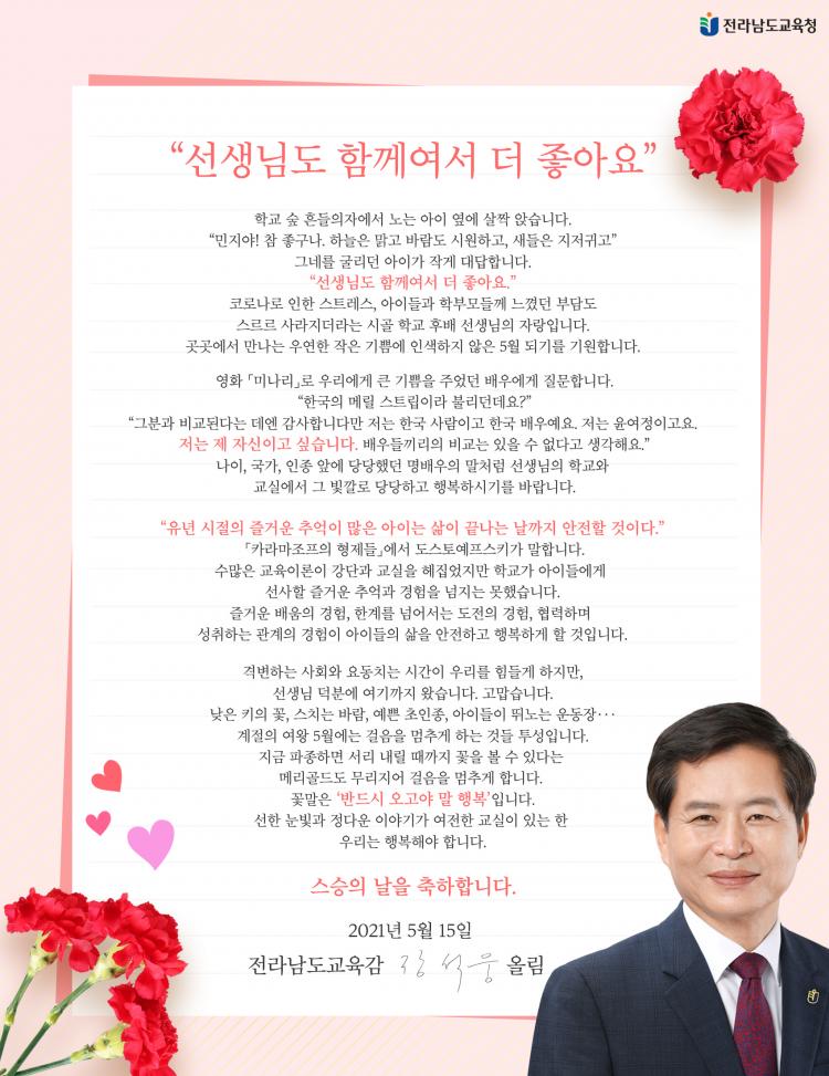 Àå¼®¿õ ±³À°°¨Àº À̳¯ Àü¶ó³²µµ±³À°Ã»ÀÌ Á¦ÀÛÇØ ȨÆäÀÌÁö¿Í À¯Æ®ºê ä³Î(Àü³²±³À°TV) µî¿¡ ¿Ã¸° ½º½ÂÀÇ ³¯ ÃàÇÏ¿µ»ó¿¡ Ãâ¿¬ÇØ ¡°Á¦40ȸ ½º½ÂÀÇ ³¯À» ¸Â¾Æ Àü³²ÀÇ ¸ðµç ¼±»ý´Ôµé²² ±íÀº Á¸°æ°ú °¨»çÀÇ ¸¶À½À» ÀüÇÑ´Ù.¡±°í ¸»Çß´Ù.