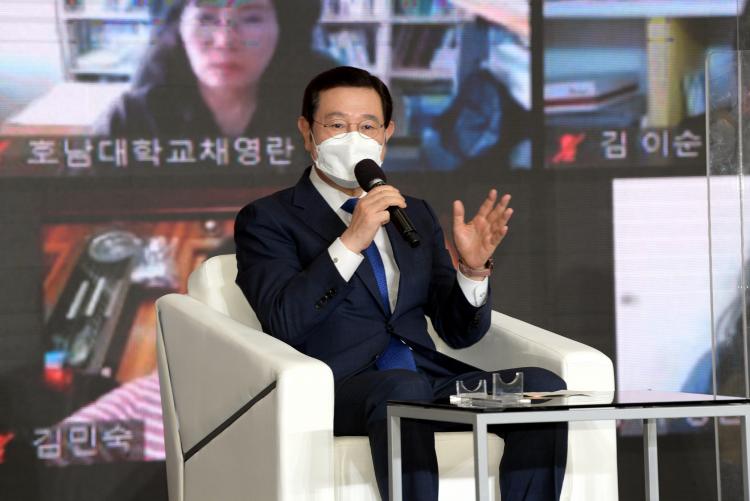 ±â³ä½ÄÀº Äڷγª19·Î ÀÎÇØ À§·Î¹Þ°í ÀÀ¿ø¹Þ¾Æ¾ß ÇÒ ½Ã¹Î Áß ±¤ÁÖÀÇ ¹Ì·¡ÀÎ ¾ÆÀÌµé Æ¯È÷ Áö³ÇØ ÃʵîÇб³ 1³âÀ¸·Î ÀÔÇÐÇÑ µÎ ¸íÀÇ ÇлýÀÌ ÀΰøÁö´É ¡®±¤ÁÖÇü¡¯°ú ´ëÈÇÏ¸ç µîÀåÇÏ´Â °ÍÀ¸·Î ¸·À» ¿¾ú´Ù. ÀÌ¾î °³È¸, ¿µ»ó Ãà»ç, 2021 ½Ã¹Î´ë»ó ½Ã»ó, ÆÛÆ÷¸Õ½º ±¤ÁÖÇü ÈïºÎ°¡ µîÀÇ ¼øÀ¸·Î ÁøÇàµÆÀ¸¸ç, À̾îÁø 2ºÎ Çà»ç·Î ¡®ÀüȯÀÇ ±¤À塯À» ÁÖÁ¦·Î ÇÑ ½Ã¹Î°úÀÇ ´ëȰ¡ ÆîÃÄÁ³´Ù.