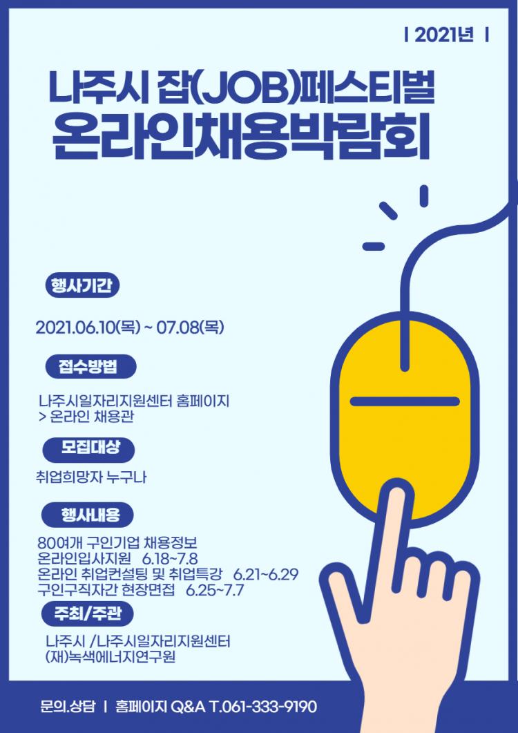 Àü¶ó³²µµ ³ªÁÖ½Ã(½ÃÀå °ÀαÔ)´Â Áö³ 18ÀϺÎÅÍ 7¿ù 8ÀϱîÁö 3ÁÖ °£ ÀÏÀÚ¸®Áö¿ø¼¾ÅÍ ´©¸®Áý¿¡¼ ¡®2021³â Àâ(JOB) Æä½ºÆ¼¹ú¡¯, ¡®¿Â¶óÀΠä¿ë¹Ú¶÷ȸ¡¯¸¦ °³ÃÖ ÁßÀ̶ó°í 23ÀÏ ¹àÇû´Ù.
