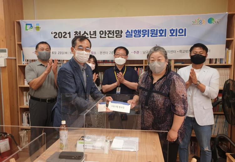 ¡Ø»çÁø¼³¸í : ±¤ÁÖ´ëÇб³(ÃÑÀå ±èÇõÁ¾)°¡ À§Å¹ ¿î¿µÇÏ´Â ³²±¸ û¼Ò³â»ó´ãº¹Áö¼¾ÅÍ¡¤Çб³¹Ûû¼Ò³âÁö¿ø¼¾ÅÍ ²Þµå¸² ÀÓÇüÅà ¼¾ÅÍÀå(¾ÕÁÙ ¿ÞÂÊ)ÀÌ 23ÀÏ ¡®2021³âµµ û¼Ò³â ¾ÈÀü¸Á 2Â÷ ½ÇÇàÀ§¿øÈ¸ ¹× »ó¹Ý±â 1388û¼Ò³âÁö¿ø´Ü ȸÀÇ¡¯¸¦ °³ÃÖÇÑ °¡¿îµ¥ »ç¶û°¡Á·ºÀ»ç´Ü ±èÇýÁ¤ ȸÀå(¾ÕÁÙ ¿À¸¥ÂÊ)À¸·ÎºÎÅÍ Ã»¼Ò³âÀ» À§ÇÑ ÈÄ¿ø±ÝÀ» ±âºÎ¹Þ°í ÀÖ´Ù.