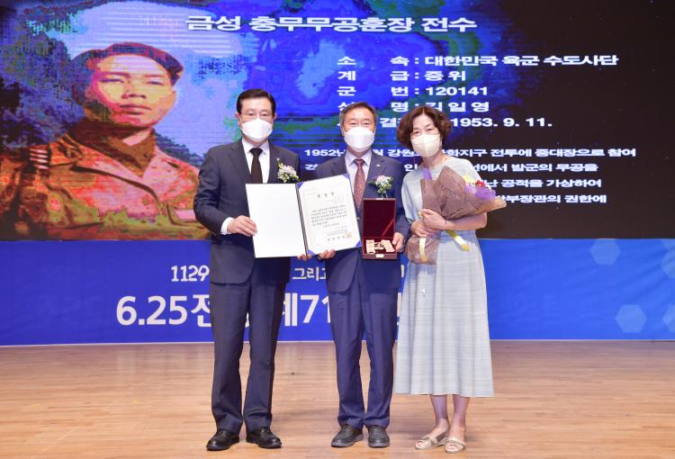 ƯÈ÷ À̳¯ ±â³ä½Ä¿¡¼´Â 1952³â 10¿ù °¿øµµ öÀÇ »ï°¢Áö´ë ±ÝÈÁö±¸ ÀüÅõ¿¡¼ ¹ß±ºÀÇ ¹«°øÀ¸·Î 1953³â 9¿ù ¼ÈÆ °áÁ¤µÆ´ø ±¤ÁÖÃâ½Å ÀüÀï À¯°øÀÚ Íº ±èÀÏ¿µ ÁßÀ§(À°±º ¼öµµ»ç´Ü)¿¡ ´ëÇÑ ±Ý¼ºÃ湫¹«°øÈÆÀåÀ» À̿뼷 ½ÃÀåÀÌ 68³â ¸¸¿¡ À¯Á·ÀÎ Àå³² ±è±Õ¼ö(65) ¾¾¿¡°Ô Àü¼öÇß´Ù.