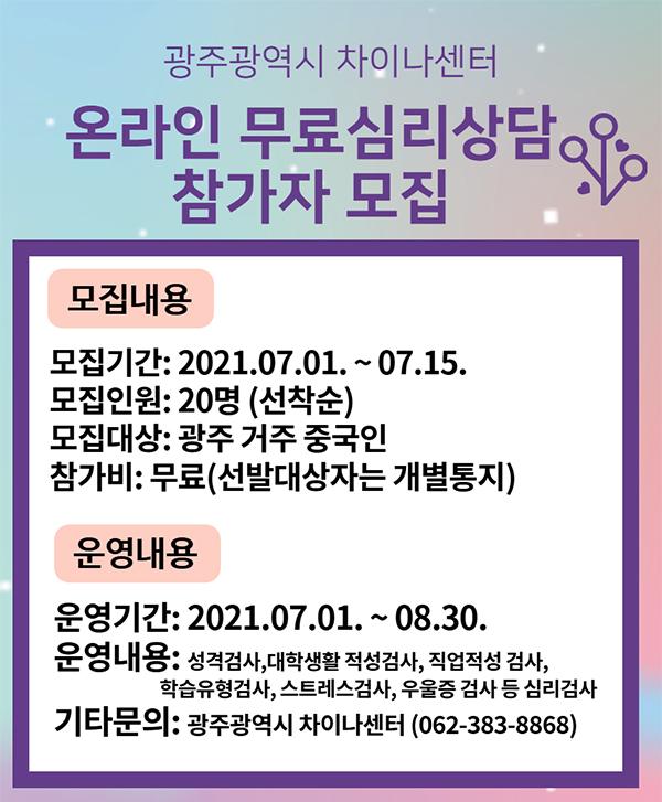 ¡®Ã£¾Æ°¡´Â »ó´ã¼¾ÅÍ¡¯´Â 7¿ù1ÀÏ~15ÀϱîÁö 20¸íÀ» ¼±Âø¼ø ¸ðÁýÇϸç, Â÷À̳ª¼¾ÅÍ È¨ÆäÀÌÁö(www.gwangjucfc.kr)¸¦ ÅëÇØ ½ÅûÇÏ¸é µÈ´Ù. ±âŸ ÀÚ¼¼ÇÑ »çÇ×Àº (062-383-8868)·Î ¹®ÀÇÇÏ¸é µÈ´Ù.