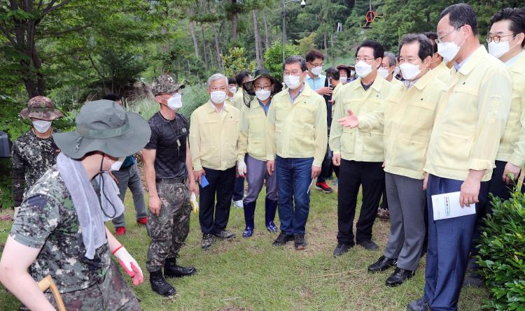 À̳¯ Æ÷·¹½ºÆ®¼ö¸ñ¿ø º¹±¸ÇöÀå¿¡´Â Á¶¼ÓÇÑ ¿ø»óȸº¹À» À§ÇØ Àü³²µµÃ» °ø¹«¿ø 50¿© ¸í°ú ÇÔ²² ÇØ³²±ºÃ», ±ººÎ´ë ¾à 80¿© ¸íÀÌ ÀÚ¿øºÀ»ç¸¦ ³ª¿Í ±¸½½¶¡À» Èê·È´Ù.