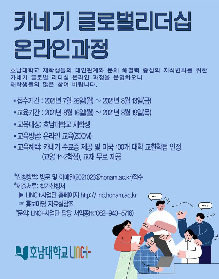 ±³À° Âü¿© Èñ¸ÁÀڴ ȣ³²´ëÇб³ ȨÆäÀÌÁö °Ô½Ã±Û¿¡¼ Ä«³×±â ±Û·Î¹ú¸®´õ½Ê ¿Â¶óÀΰúÁ¤ Âü°¡½Åû¼¸¦ ³»·Á ¹Þ¾Æ ¿À´Â 8¿ù13ÀϱîÁö ´ëÇк»ºÎ 3Ãþ LINC+»ç¾÷´ÜÀ» ¹æ¹®Çϰųª À̸ÞÀÏ(2021023@honam.ac.kr)·Î Á¦ÃâÇÏ¸é µÈ´Ù.
