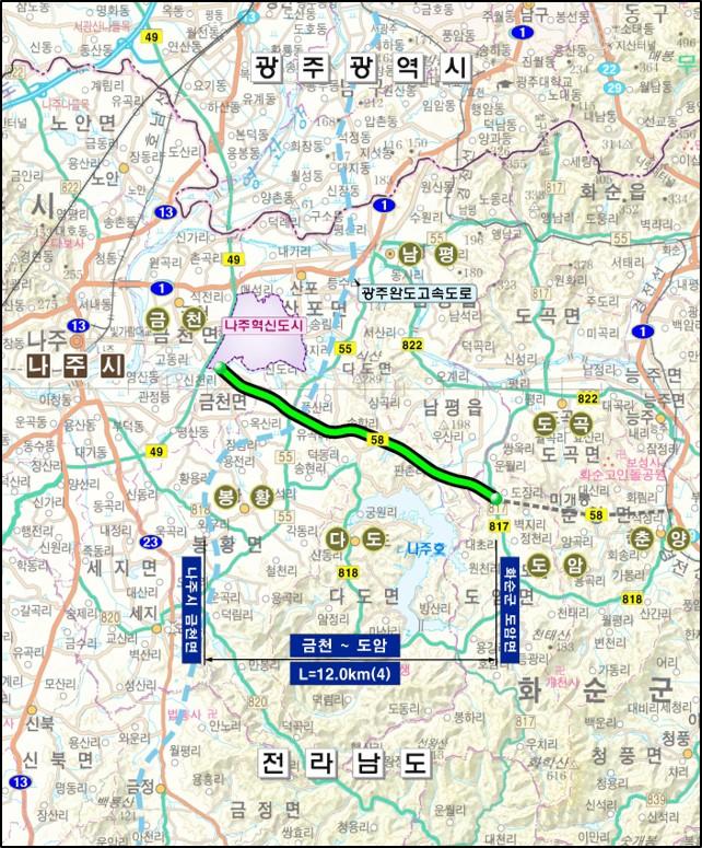 Àü¶ó³²µµ ³ªÁÖ½Ã(½ÃÀå °ÀαÔ)´Â Áö³ 24ÀÏ ¡®³ªÁÖ ±Ýõ¸é ~ ȼø µµ¾Ï¸é¡¯ ÃÑ 12km±¸°£, ±¹Áöµµ 58È£¼± 4Â÷¼± µµ·Î ½Å¼³»ç¾÷ÀÌ ±âȹÀçÁ¤ºÎ ¿¹ºñŸ´ç¼º Á¶»ç¸¦ ÃÖÁ¾ Åë°úÇß´Ù°í 26ÀÏ ¹àÇû´Ù.