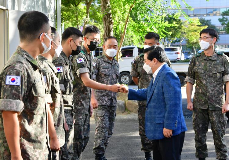 À¯µÎ¼® ±º¼ö´Â ±ººÎ´ë À庴µé°ú ¼Ò¹æ°ø¹«¿ø, ¿ìü±¹ Áý¹è¿ø µîÀÌ ±Ù¹«ÇÏ´Â ÇöÀåÀ» Á÷Á¢ ã¾Æ°¡ °¨»ç Àλ縦 ÀüÇß´Ù. ÀÌ¾î¼ Áö¿ª ³» º¹Áö½Ã¼³À» À§¹®ÇÏ°í °ü°èÀÚµéÀ» °Ý·ÁÇß´Ù.