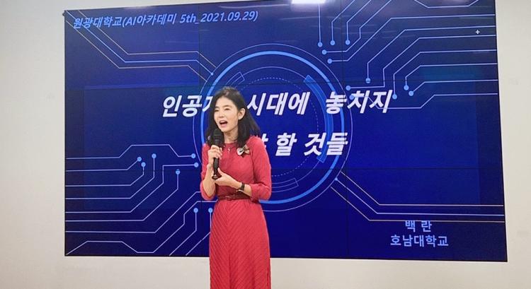¿ø±¤´ëÇб³¿¡¼ ÁÖÃÖÇÑ Á¦5ȸ AI¾ÆÄ«µ¥¹Ì¿¡ ÃÊû¹ÞÀº ¹é¶õ ±³¼ö´Â À̳¯ ¿ÀÀü 11½Ã ¿ø±¤´ë Àü±³»ýÀ» ´ë»óÀ¸·Î ¡®ÀΰøÁö´É ½Ã´ë¿¡ ³õÄ¡Áö ¸»¾Æ¾ß ÇÒ °Íµé¡¯À» ÁÖÁ¦·Î ÀΰøÁö´É½Ã´ë¿¡¼ ÀϾ´Â ±â¼ú ÇöÀå, ¹Ì·¡Á÷¾÷±º, »çȸ¹®Á¦ Çö»óµéÀ» ¼Ò°³Çß´Ù. ¹é ±³¼ö´Â À̾î ÀΰøÁö´ÉÀÇ ¼ø±â´É°ú ¿ª±â´É Çö»ó ¹× »çȸÀû ¹®Á¦ ¹ß»ý¿¡ ´ëÇÑ ±Ùº»Àû ¿øÀεéÀ» ¼³¸íÇÑ µÚ ÀΰøÁö´ÉÀÇ »ç°¢Áö´ë¿¡¼ ¹ß»ýÇÏ´Â ¹®Á¦¸¦ ¾î¶»°Ô ÇØ°áÇØ¾ß ÇÏ´Â Áö¿¡ ´ëÇÑ ¹æ¾È µî ÀΰøÁö´É½Ã´ë¸¦ ¸Â´Â ¹Ì·¡±³À°¹æÇâÀ» Á¦½ÃÇß´Ù.