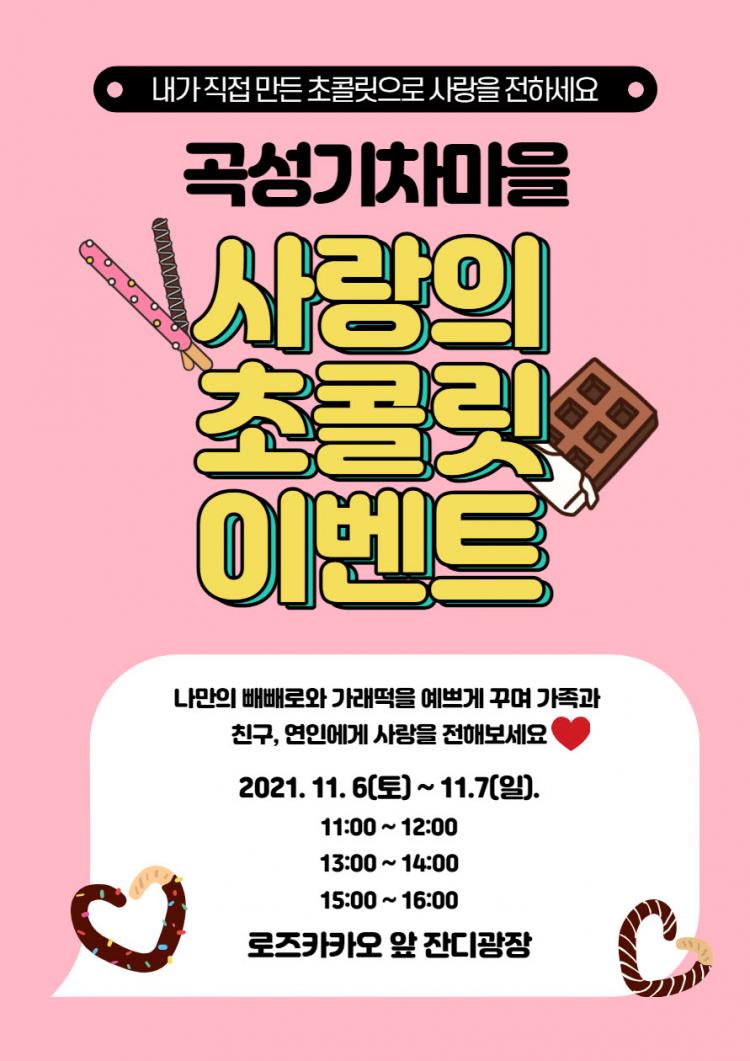 À̹ø À̺¥Æ®´Â ¡®³»°¡ Á÷Á¢ ¸¸µç ÃÊÄݸ´À¸·Î »ç¶ûÀ» ÀüÇϼ¼¿ä¡¯¶ó´Â Å׸¶·Î 11¿ù 6ÀϺÎÅÍ 7ÀϱîÁö ÁøÇàµÈ´Ù. 11¿ù 11ÀÏÀÌ ³ó¾÷ÀÎÀÇ ³¯ÀÎ °Í¿¡ Âø¾ÈÇØ °¡·¡¶±À» ÃÊÄݸ´À¸·Î ¿¹»Ú°Ô ²Ù¸ç °¡Á·°ú Ä£±¸, ¿¬Àο¡°Ô ¼±¹°ÇÏ´Â À̺¥Æ®´Ù. À̺¥Æ® Àå¼Ò´Â ¼¶Áø° ±âÂ÷¸¶À» ³» Çѱ¹ÃÊÄݸ´¿¬±¸¼Ò¹ÂÁö¾ö(·ÎÁîīī¿À) ¾Õ Àܵð±¤ÀåÀÌ´Ù.