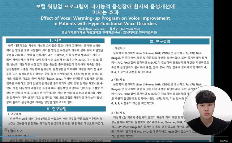 ¡®ºòµ¥ÀÌÅÍ ±â¹ÝÀÇ ÀÎÁöÀÇ»ç¼ÒÅë ÀçȰ¡¯À» ÁÖÁ¦·Î ¿¸° À̹ø °øµ¿Çмú´ëȸ¿¡¼ À¯À翬 ±³¼ö ¿¬±¸ÆÀÀº ¡®º¸Äà ¿ö¹Ö¾÷ ÇÁ·Î±×·¥ÀÌ °ú±â´ÉÀû À½¼ºÀå¾Ö ȯÀÚÀÇ À½¼º°³¼±¿¡ ¹ÌÄ¡´Â È¿°ú(¹ßÇ¥ÀÚ ÀÌÀç¼)¡¯¿Í ¡®¸¶½ºÅ© Âø¿ë°ú ¹ßȾ翡 µû¸¥ À½Áú ¹× À½¼ºÇǷεµ Ư¼º(¹ßÇ¥ÀÚ ¾çÀçÈñ)¡¯À» Æ÷½ºÅÍ ¼¼¼Ç¿¡¼ ¹ßÇ¥Çß´Ù.