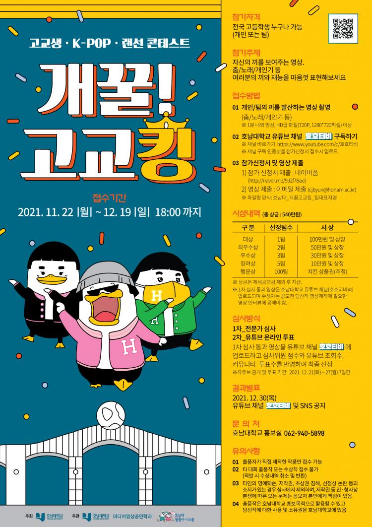 È£³²´ëÇб³ ¹Ìµð¾î¿µ»ó°ø¿¬Çаú(ÇаúÀå ÃÖ¿µÈ)¿Í È£³²´ëÇб³ ¶ö¶ö¶ó½ºÄð(´ëÇ¥ Á¤À±Èñ)ÀÌ ÁÖ°üÇÏ´Â ¡®°³²Ü! °í±³Å·¡¯ Àº ¿À´Â 11¿ù 22ÀϺÎÅÍ Á¢¼ö¿¡ µé¾î°¡¸ç Âü°¡ Èñ¸ÁÀÚ´Â ³×À̹öÆû(http://naver.me/592f7Bae)¿¡ Âü°¡ ½Åû ÈÄ Ãã°ú ³ë·¡, °¢Á¾ °³Àα⠵î À帣¸¦ ºÒ¹®ÇÏ°í º»Àθ¸ÀÌ °¡Áø ƯÃâÇÑ Àç´É°ú ³¢¸¦ ´ãÀº 1ºÐ ³»¿ÜÀÇ ¿µ»ó ¿øº»(HD±Þ ÈÁú 1280*720Çȼ¿ ÀÌ»ó)À» À̸ÞÀÏ(cjbyun@honam.ac.kr)·Î Á¦ÃâÇÏ¸é µÈ´Ù.