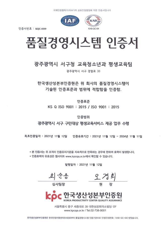 ¼±¸Ã» °ü°èÀÚ´Â ¡°À̹ø ISO 9001 ÀÎÁõÀ» °è±â·Î ±¤ÁÖ ¼±¸°¡ Àü±¹¿¡¼ ´ëÇ¥ÀûÀÎ Æò»ýÇнÀµµ½Ã·Î ¹ßÀüÇÏ±æ ±â´ëÇÑ´Ù¡±°í ¸»Çß´Ù.