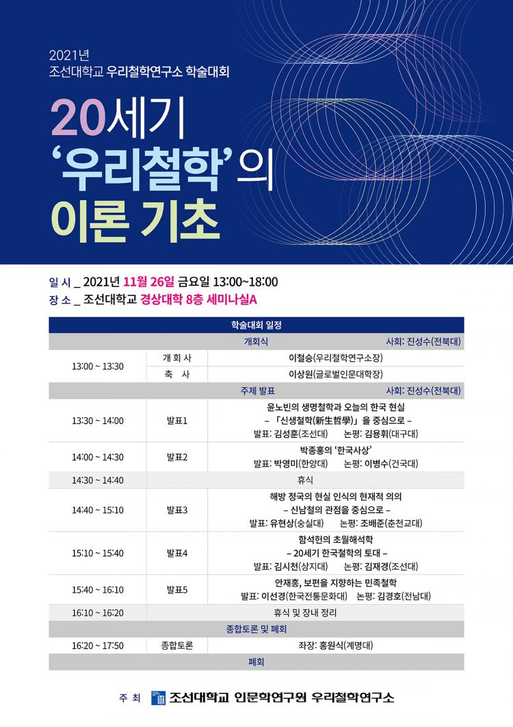 ¿À´Â 26ÀÏ Á¶¼±´ëÇб³ °æ»ó´ëÇÐ 8Ãþ ¼¼¹Ì³ª½ÇA¿¡¼ ¿¸®´Â Çмú´ëȸ´Â 20¼¼±â ¿ì¸®Ã¶ÇÐÀÇ ÀÌ·Ð Á¤¸³ ¿¬±¸¸¦ À§ÇØ ¸¶·ÃµÆÀ¸¸ç Çѱ¹ öÇÐÀÇ °³³äÀ» ´Ù·ç°í ÇöÀçÀû ÀÇÀÇ, ¹ÎÁ·Ã¶ÇÐ µîÀ» ´Ù·é´Ù.
