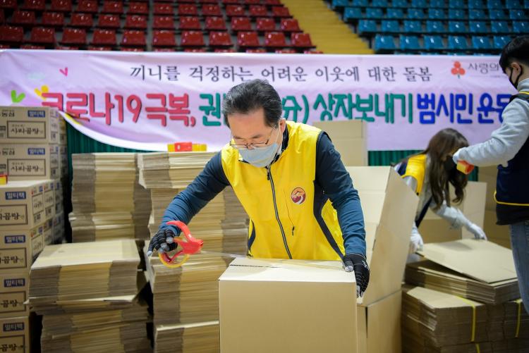 ½ÃÁð 1Àº ¡®±ÇºÐ»óÀÚ º¸³»±â¿îµ¿¡¯ÀÌ´Ù. Äڷγª19·Î ¹«·á(´Üü)±Þ½ÄÀÌ ÇÊ¿äÇÑ ºÐµéÀ» ½ÃÀÛÀ¸·Î µ¶°Å³ëÀÎ, ´Ù¹®È°¡Á¤, Çб³ ¹Û û¼Ò³â µî¿¡°Ô ±ÇºÐ»óÀÚ°¡ Àü´ÞµÆ´Ù. ½Ã¹Î ±âºÎ±ÝÀº 2¾ï4600¸¸ ¿øÀÌ ¸ð¾ÆÁ³´Ù. À¯°ü±â°ü ´Üü, °¢Á¾ µ¿¿ìȸ µîÀÇ ±âºÎ ¸±·¹ÀÌ·Î À̾îÁ³´Ù.