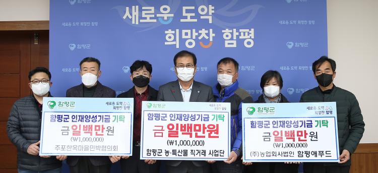 ÇÔÆò±º ÀÎÀç¾ç¼º ±â±ÝÀ¸·Î ¡ãÁÖÆ÷ÇÑ¿Á¸¶À»¹Î¹ÚÇùÀÇȸ(´ëÇ¥ ¼³¿µÈ£) ¡ãÇÔÆò±º ³ó¡¤Æ¯»ê¹° Á÷°Å·¡ »ç¾÷´Ü(´ëÇ¥ ÇÞ¸¾Àâ°î Á¤±â±Ù) ¡ã³ó¾÷ȸ»ç¹ýÀÎ ÇÔÆò¾ÖǪµå(³ª»ê¸é¡¤´ëÇ¥ Á¤¹Ì°æ) ¡ãÇÔÆòÀ¾ ´ëÈï½Ä´ç(´ëÇ¥ õÀçÈ«)¿¡¼ °¢ 100¸¸¿ø¾¿ ÃÑ 400¸¸¿øÀ» ±âŹÇß´Ù.