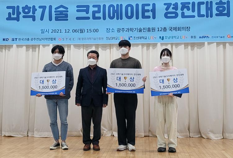 12¿ù 6ÀÏ ±¤ÁÖ°úÇбâ¼úÁøÈï¿ø ±¹Á¦È¸Àǽǿ¡¼ ¿¸° ½Ã»ó½Ä¿¡¼ ´ë»óÀ» ¼ö»óÇÑ ½Å¹®¹æ¼ÛÇаú ¡®ON-AIR¡¯ µ¿¾Æ¸®(ȸÀå ¾çÈ«¹Î¡¤3Çгâ)ÀÇ UCC ¿µ»óÀº ¡®°úÇÐ ±â¼úÀÌ ¿ì¸®ÀÇ ¹Ì·¡¡¯¶ó´Â ÁÖÁ¦·Î ¹®Ã¤ºó(4Çгâ) ÇлýÀ» ÁÖÀΰøÀ¸·Î ¿µ»óµ¿¾Æ¸® ÇлýµéÀÌ Á÷Á¢ Ã⿬ÇÑ ÀÛǰÀ¸·Î, ¹Ì·¡±â¼úÀÌ ¿ì¸®ÀÇ »ýȰÀ» ¾î¶»°Ô ¹Ù²Ù°í ÀÖ´ÂÁö¸¦ Ç¥ÇöÇϱâ À§ÇØ 3D ¿µ»óÁ¦ÀÛ±â¹ýÀ» »ç¿ëÇØ È£ÆòÀ» ¹Þ¾Ò´Ù.