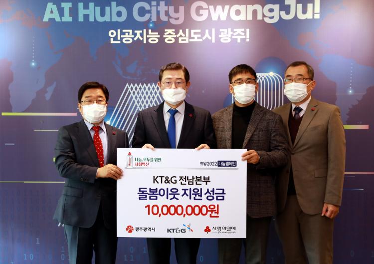 KT&G Àü³²º»ºÎ´Â »çȸº¹Áö½Ã¼³ ÇöÀå Áö¿øÀ» À§ÇÑ ¼º±Ý 1000¸¸¿øÀ» Àü´ÞÇß´Ù. KT&G Àü³²º»ºÎ´Â Áö³ÇØ 1000¸¸¿ø, 2019³â 1000¸¸¿ø µî Áö¼ÓÀûÀÎ ±âºÎ Ȱµ¿À» À̾î¿À°í ÀÖ´Ù.